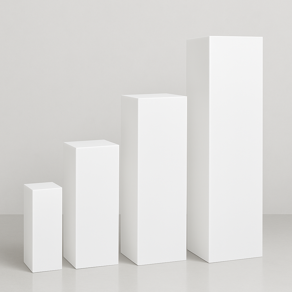 Set de coloane decorative fabricate din plexiglas alb opac de 3mm, format din 4 bucăți cu dimensiuni diferite: 600 x 200 mm, 800 x 200 mm, 1000 x 200 mm și 1200 x 200 mm.