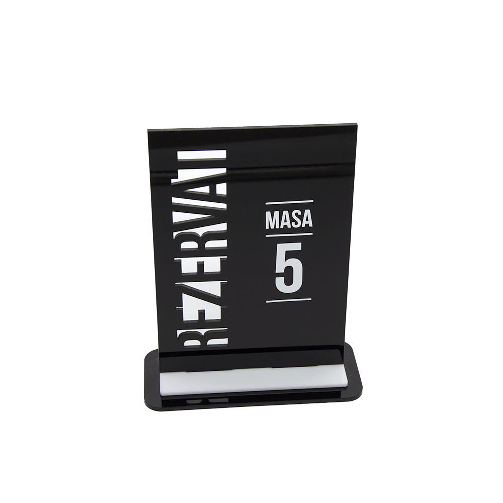Plăcuță personalizată „Rezervat” cu număr de masă, realizată din plexiglas de calitate superioară, în combinație elegantă de negru mat și alb lucios. Textul „Rezervat” este tăiat cu laser, oferind un efect vizual premium, iar numărul mesei este aplicat prin autocolant profesional, durabil și ușor de citit.