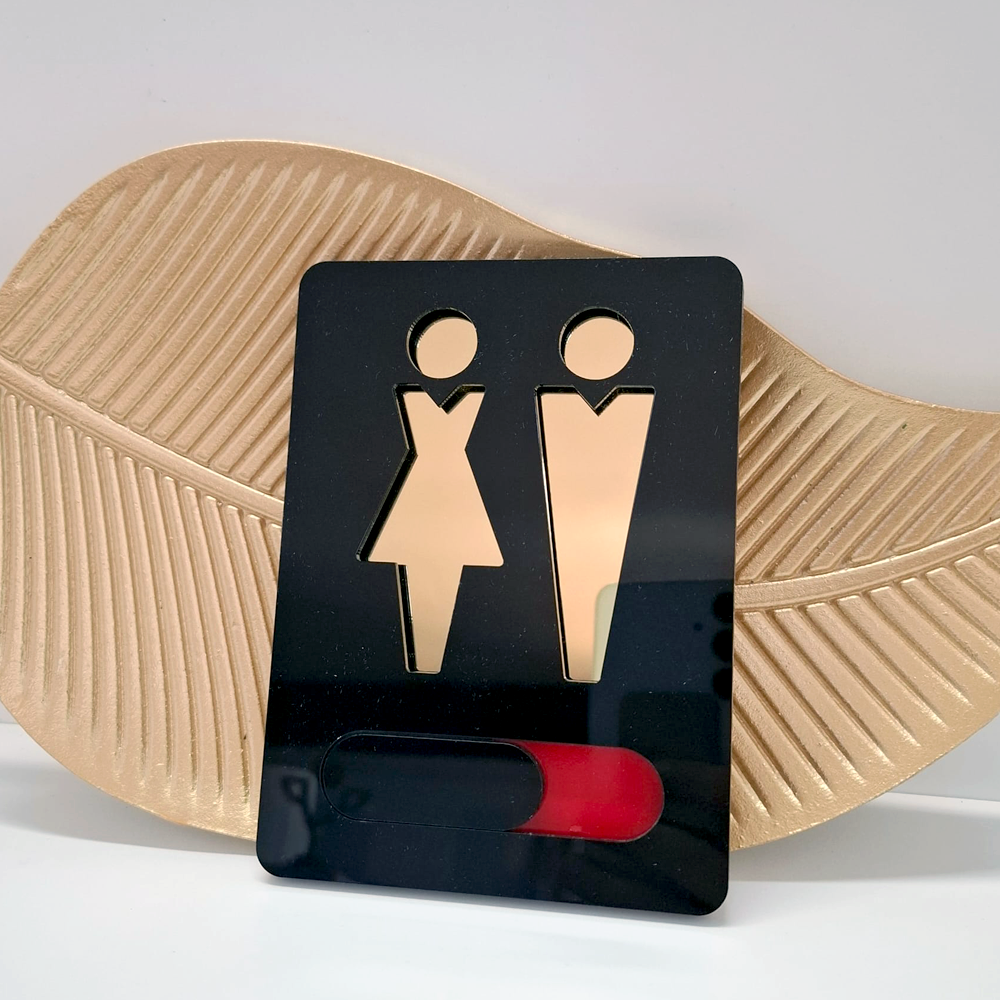 Adaugă un plus de eleganță și funcționalitate spațiilor tale cu această plăcuță pentru toaletă mixtă, realizată din plexiglas negru lucios și decorată cu elemente aurii premium, decupate la laser.