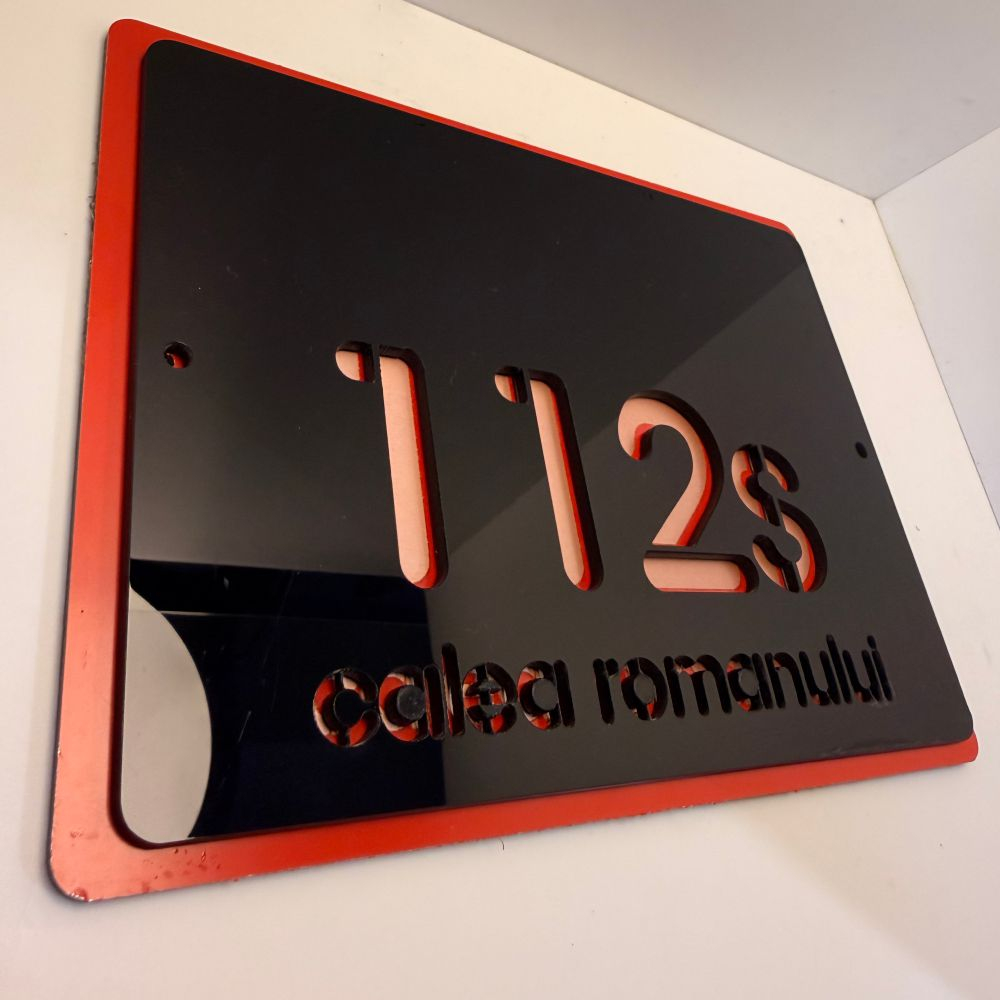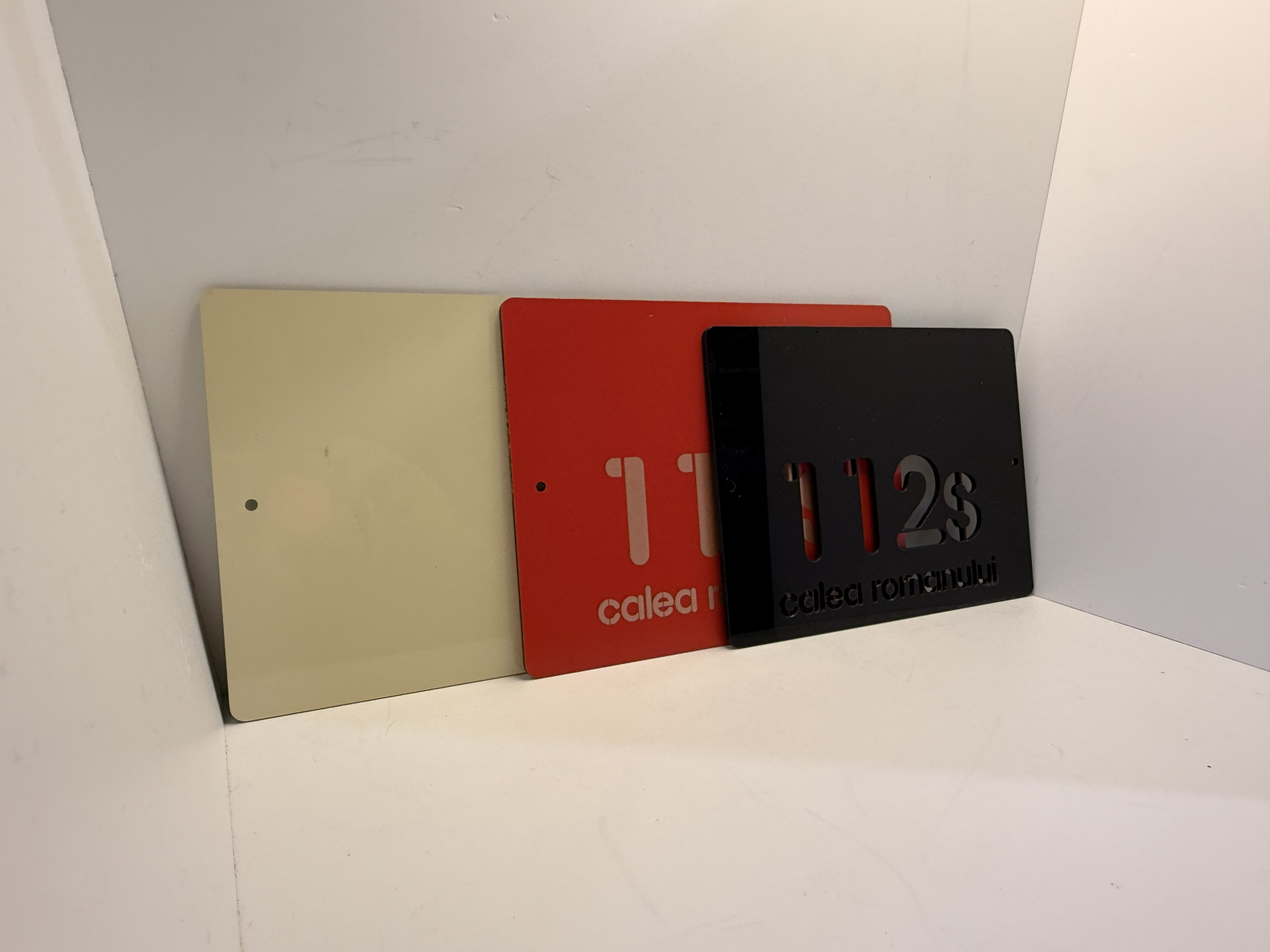Plăcuță adresă casă din alucobond și plexiglas decupat, disponibilă în multiple combinații de culori. Modernă, rezistentă și complet personalizabilă.