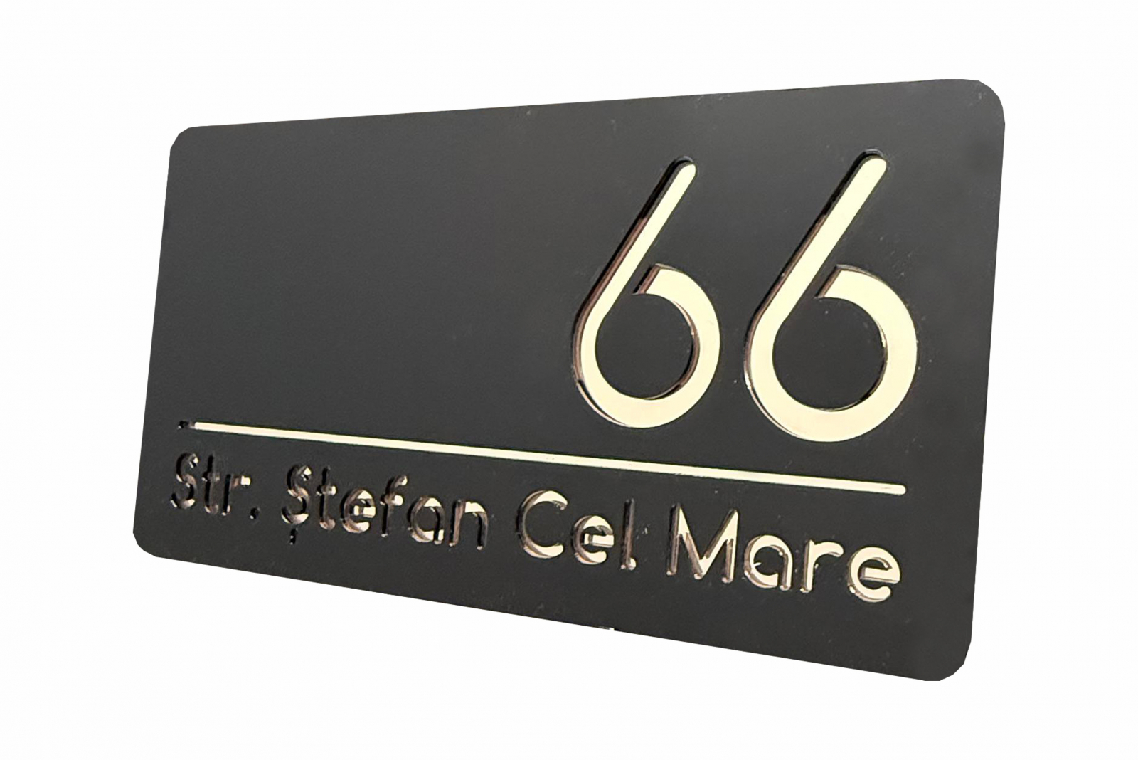 Plăcuță adresă plexiglass oglindă gold / negru lucios cu text decupat. Eleganță și vizibilitate, ideală pentru casă, apartament sau bloc.