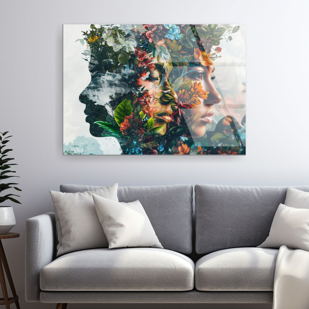 Arta digitala de tip Suprarealism Ecologic si Double Exposure Photography. Evoca unitatea cu natura, diversitatea gandurilor si pacea interioara prin peisaje si flori integrate armonios in chipurile feminine.