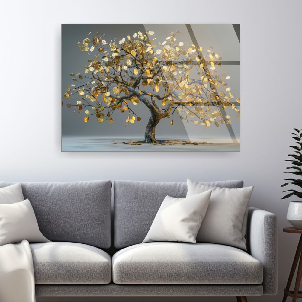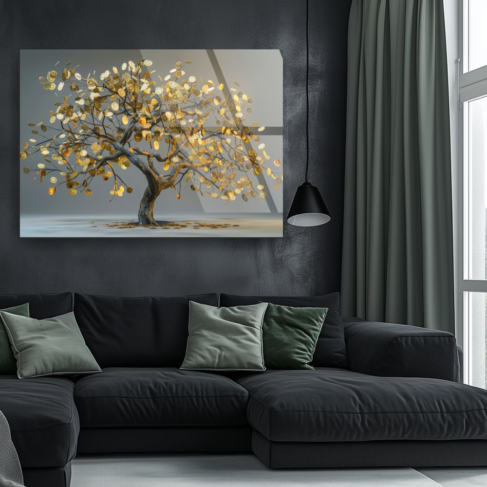 Imaginea prezinta un copac tridimensional stilizat, cu ramuri solide si frunze reprezentate sub forma de monede aurii. Fundalul in nuante de gri creeaza un contrast elegant, permitand elementelor aurii sa iasa in evidenta fara a domina agresiv compozitia. Aspectul general este echilibrat si sofisticat, cu o simbolistica discreta legata de crestere, stabilitate si valoare.