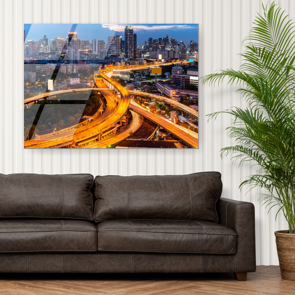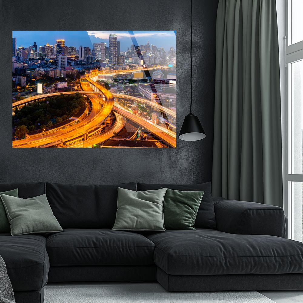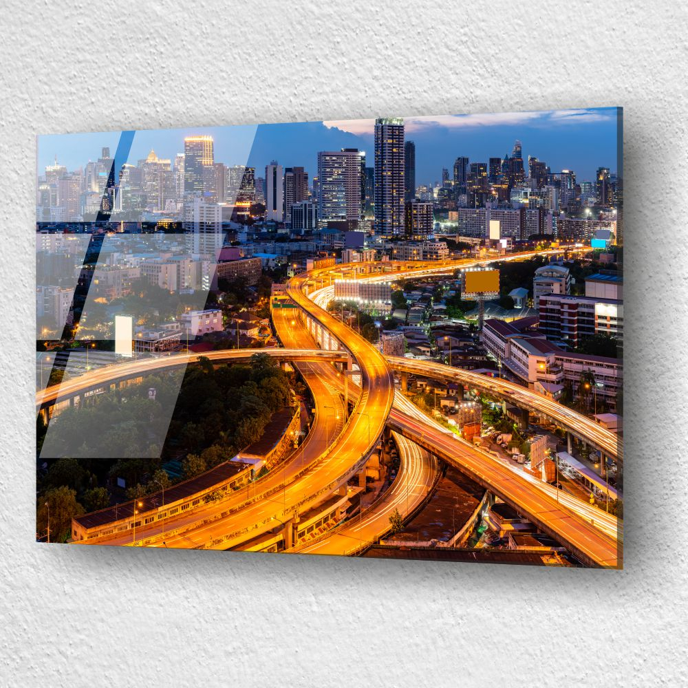 Un peisaj urban vazut de sus, in care autostrazile se impletesc printre zgarie-nori, sub lumina calda a apusului. Un tablou din sticla acrilica care aduce dinamism si profunzime in orice spatiu modern.