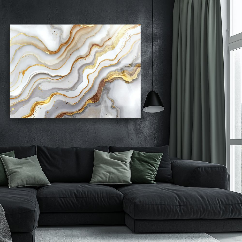 Tabloul este realizat din sticlă acrilică (plexiglas) de 5 mm și imprimat UV la rezoluție înaltă. Claritatea materialului evidențiază contrastul dintre tonurile neutre ale bazei și reflexiile metalice aurii.