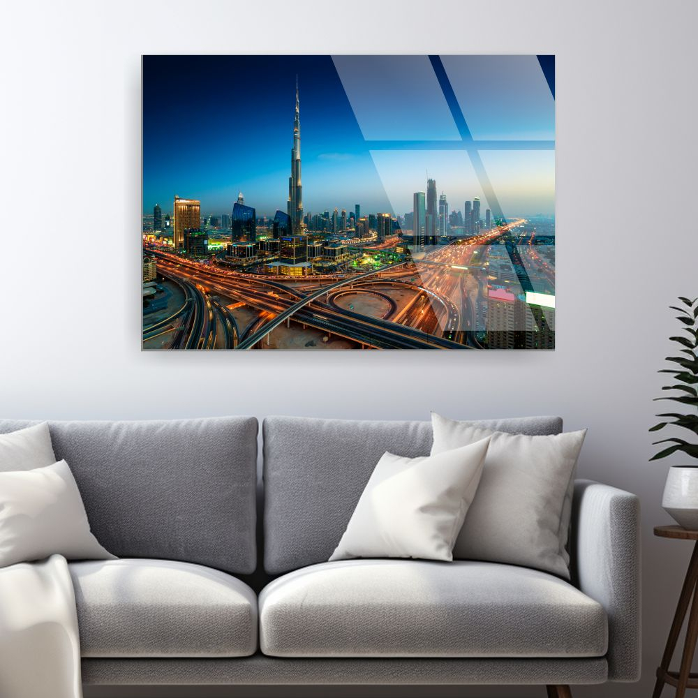 Tabloul este realizat din sticla acrilica (plexiglas) premium, cu print UV de inalta rezolutie. Suprafata lucioasa intensifica contrastele dintre luminile urbane si tonurile reci ale cerului, oferind claritate si profunzime imaginii.